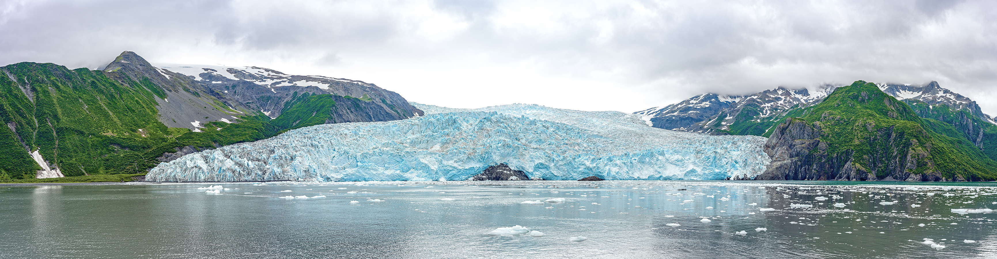 Panorama des Aialik-Gletschers in der Aialik-Bay an der Südküste Alaskas. Panorama vom 28. Jul. 2024 aus insgesamt 9 Einzelaufnahmen mit Hasselblad X2D 100C und Objektiv XCD 38 mm f/2.5 V bei f/6.8 und 200 Asa (Originalgrösse: 157 Megapixel).